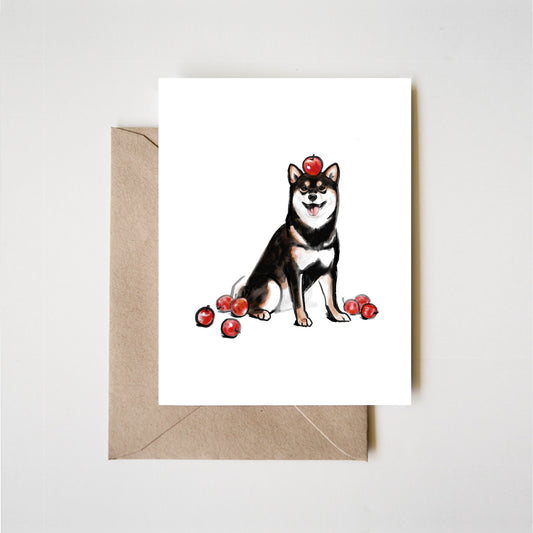 Apple and Shiba Inu Greeting Card | Black&Tan Sumi-e Painting Ink Illustration Zen Asian Dog Puppy Anniversary Baby Shower Pet Lovers