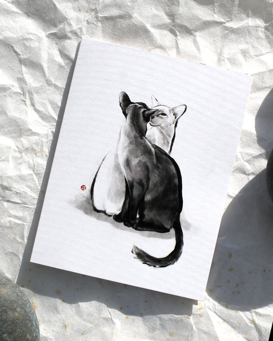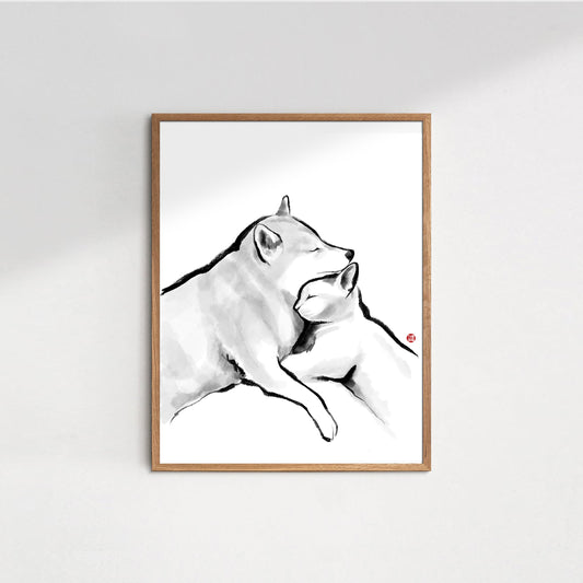 Shiba Inu and Cat Hug, Lean On Me Art Print | Sumi-e Ink Painting Poster Pet illustration Wabi Sabi Asian zen theme Dog lover Friendship