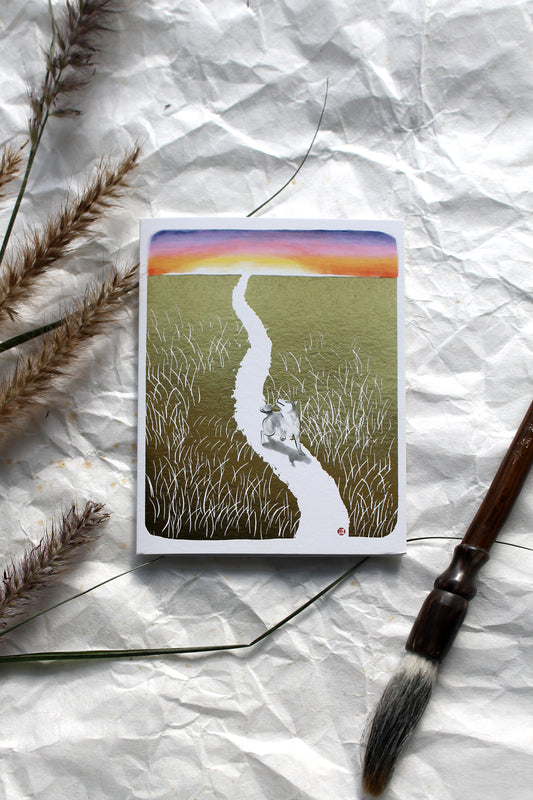 Golden Field Shiba Greeting Card | Autumn Thanksgiving Sumi-e Painting Holidays Ink
