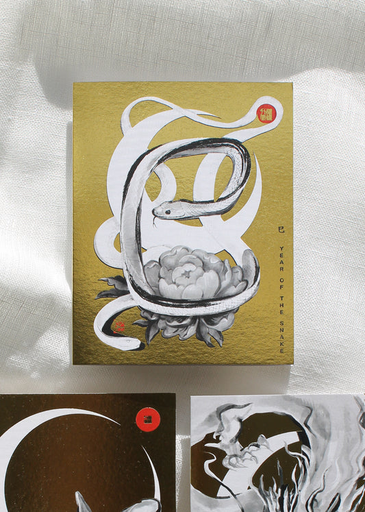 Year of Snake Golden Zodiac Greeting Card, Chinese Letters inspired Symbolic Animal Sumi-e Painting Ink Zen Birthday New Year (Copy)