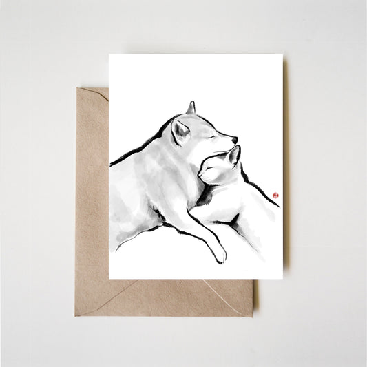 Shiba Inu and Cat Hug, Lean On Me Greeting Card | Sumi-e Ink Painting Pet illustration Wabi Sabi Asian Brush Zen theme Dog lover Friendship