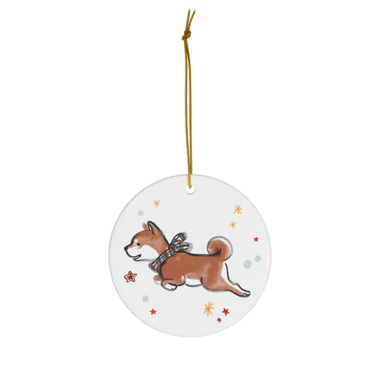 Running Shiba Inu Ceramic Ornament | Christmas Tree Deco Holidays Dog Pet Lovers Gift Cute Snow Jingle Bell Star