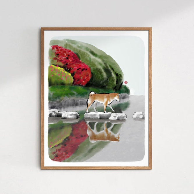 Step into a moment of stillness with "Reflection," a serene sumi ink and watercolor-inspired illustration of a Shiba Inu crossing a peaceful pond. This artwork captures the harmony of nature, featuring a lush Japanese garden, autumn foliage, and the dog’s reflection in the water—symbolizing balance, mindfulness, and quiet confidence.