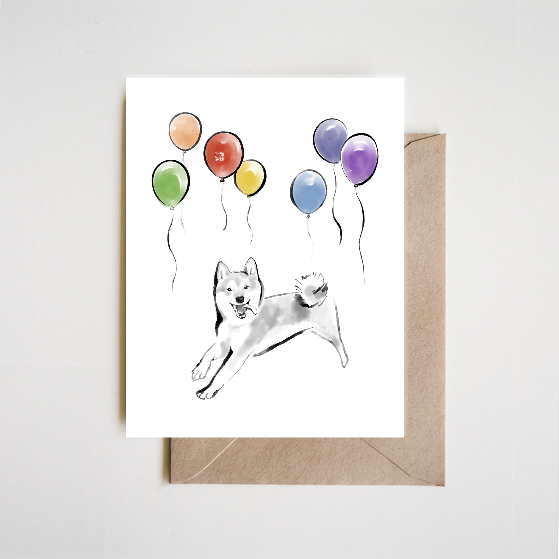 A joyful sumi ink illustration of a playful Shiba surrounded by colorful balloons. This design captures the lighthearted energy of celebration, blending traditional brushwork with a bright, modern touch. Perfect for birthdays or any happy occasion.