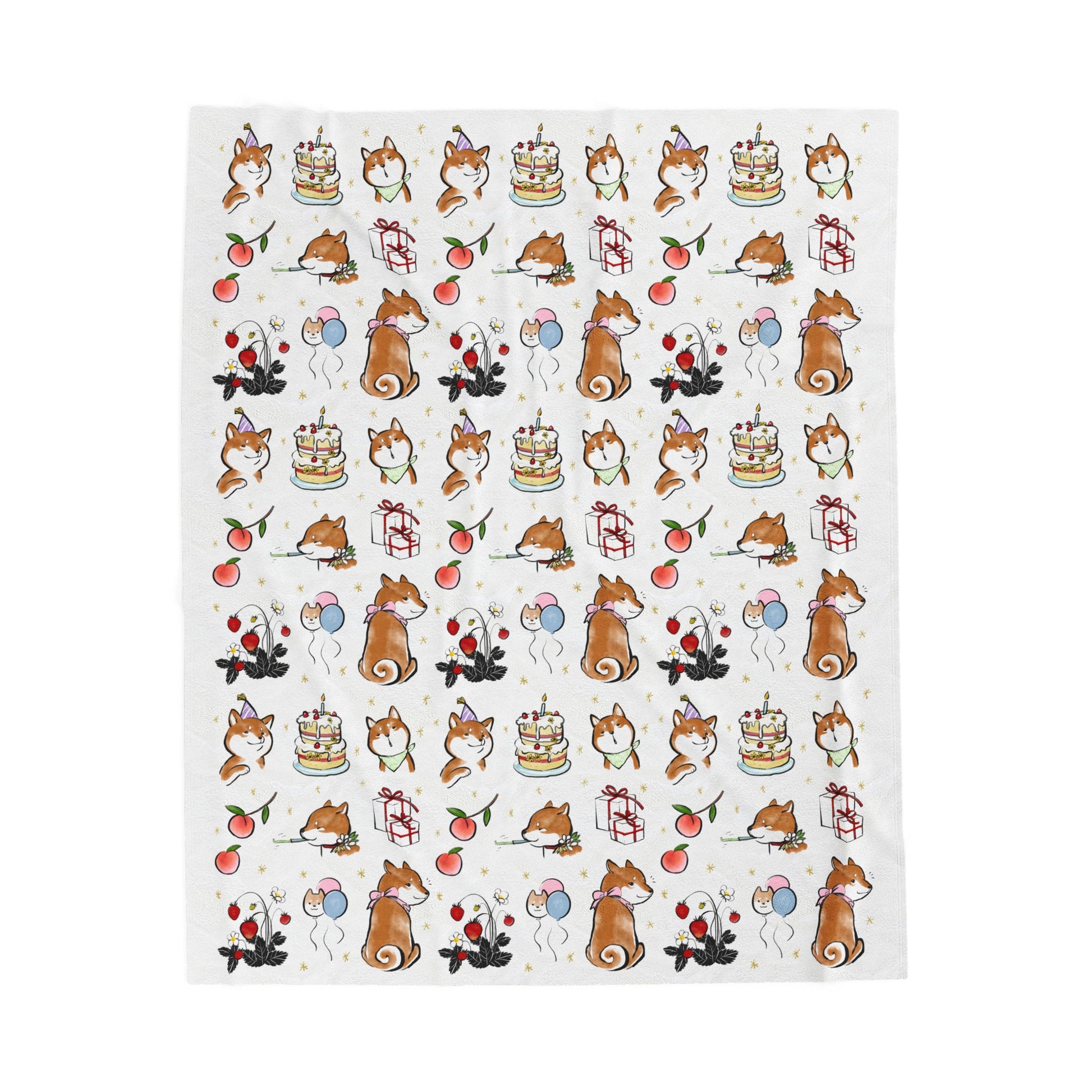 Wrap yourself in soft, joyful comfort with this velveteen plush blanket featuring playful Shiba illustrations — birthday cake, gifts, peaches, strawberries and small celebratory moments scattered across a creamy backdrop. The cuddly pile feels warm against skin and keeps its shape wash after wash, while the single-sided, high-detail print keeps the artwork bright and lively. Tuck it over your lap on a quiet evening, spread it across a couch for an instant cozy scene, or bring it along to low-key celebrations where comfort and cute details matter. The blanket’s medium-heavy weight and neat double-needle stitching give it a reassuring heft and durability you’ll notice every time you reach for it.